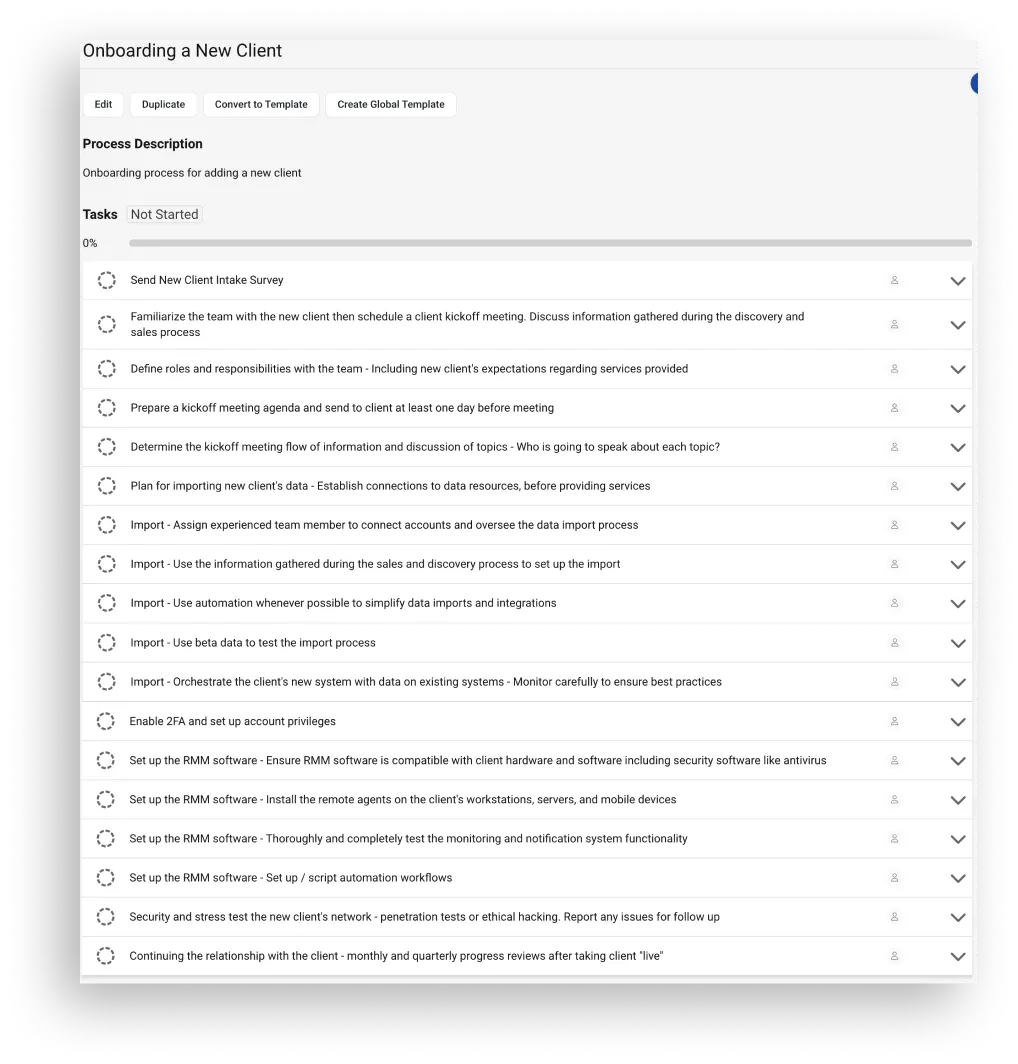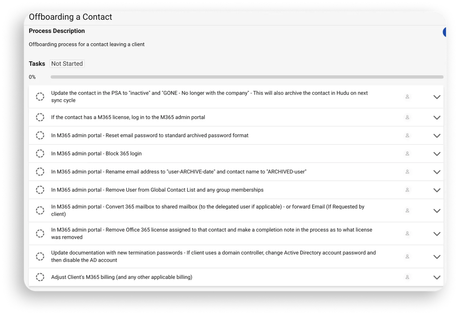 In a previous tip, we talked about Global Process Templates (GPTs), but this week we are diving into a specific way to use them: onboarding and offboarding processes in Hudu, created as GPTs. Creating a GPT for your onboarding process allows you to standardize that process and ensure all aspects of your onboarding SOP will be completed through the process. Below, we have attached some screenshots of examples of onboarding and offboarding processes for a new contact/user that we have seen customers use. We also included an example process of onboarding a new client. As always, your team can utilize these as a starting place, but make changes as needed.