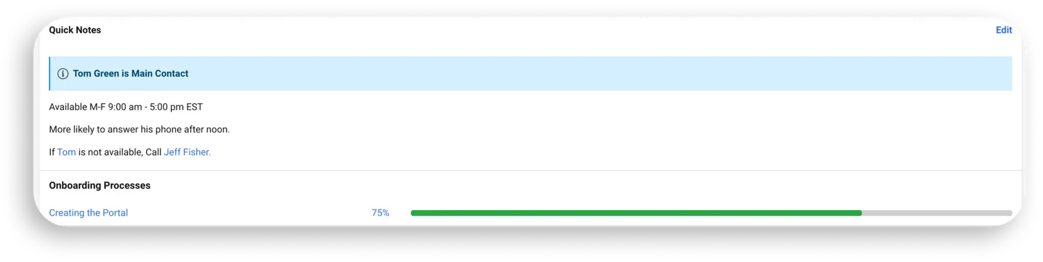 Another feature that Hudu provides is the ability to set process templates as "Onboarding Processes". If this is set, as soon as a process is activated, it will show up on the company page as an onboarding process, as seen in the image below. This allows for easy viewing and access to the process so you can make sure that a new client or employee is fully onboarded (or offboarded if you choose to use it that way):