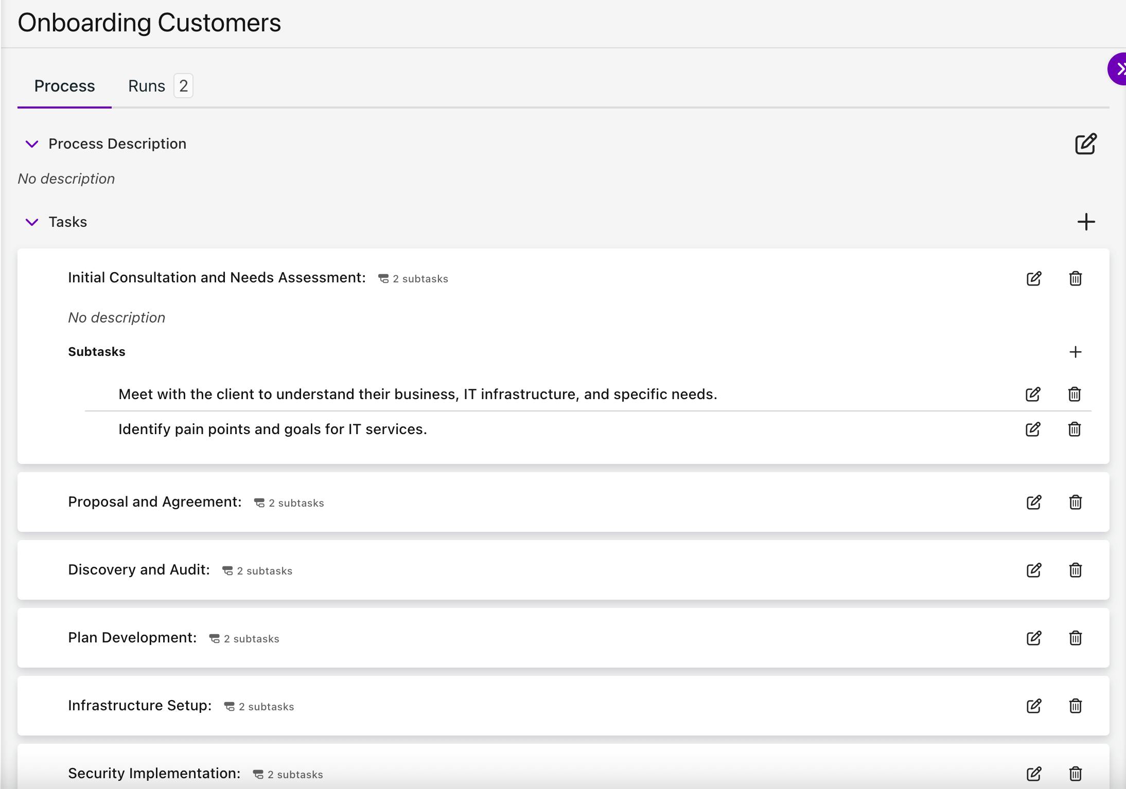 Each process step can have subtasks. These help clarify detailed work without turning a single task into a wall of text.