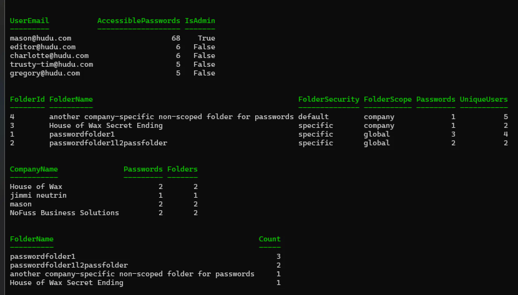 If you are a 'Totally Tabular' kind of user, this is just the tool for you- the results export to a few handy csv's for any drilldown or analysis needed (no actual passwords included in these tables).
