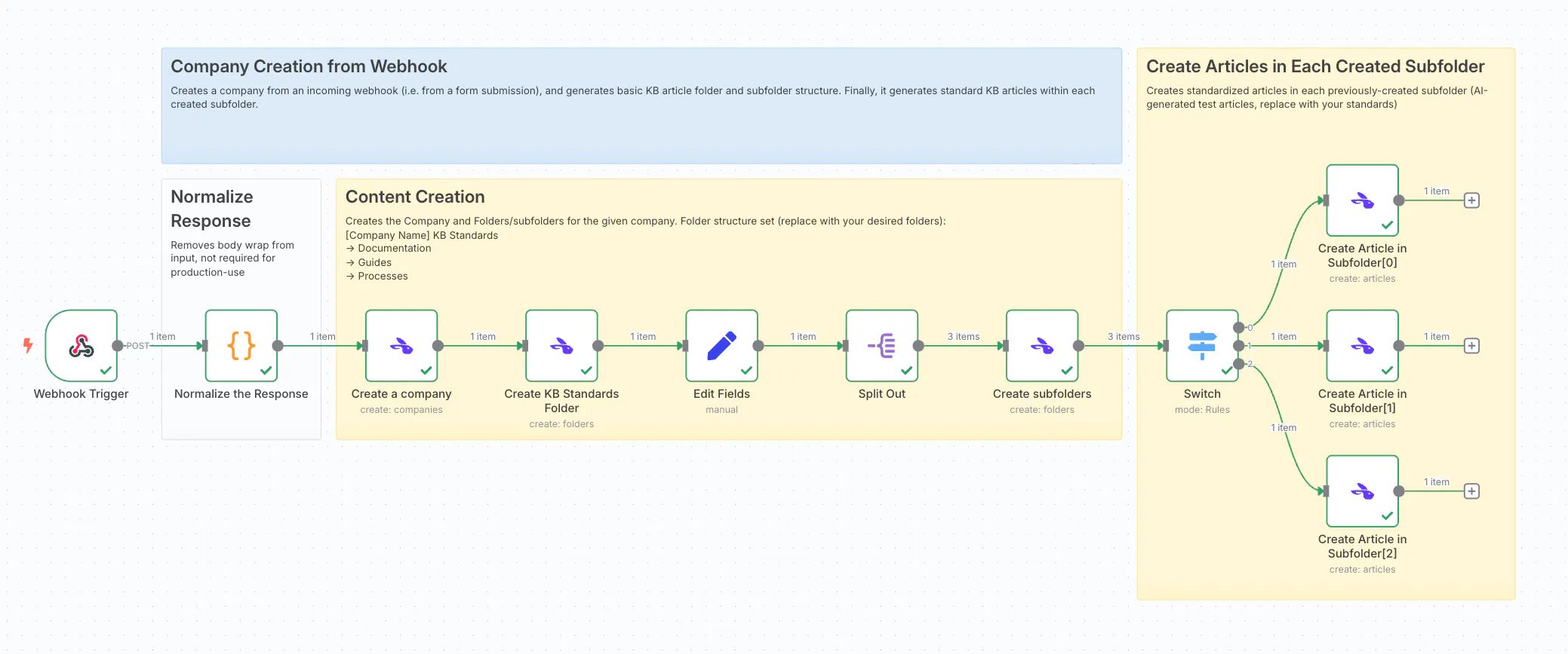 Workflow to create a company, generate a default KB folder/subfolder structure, and seed that structure with standard articles โ all triggered from an incoming webhook.