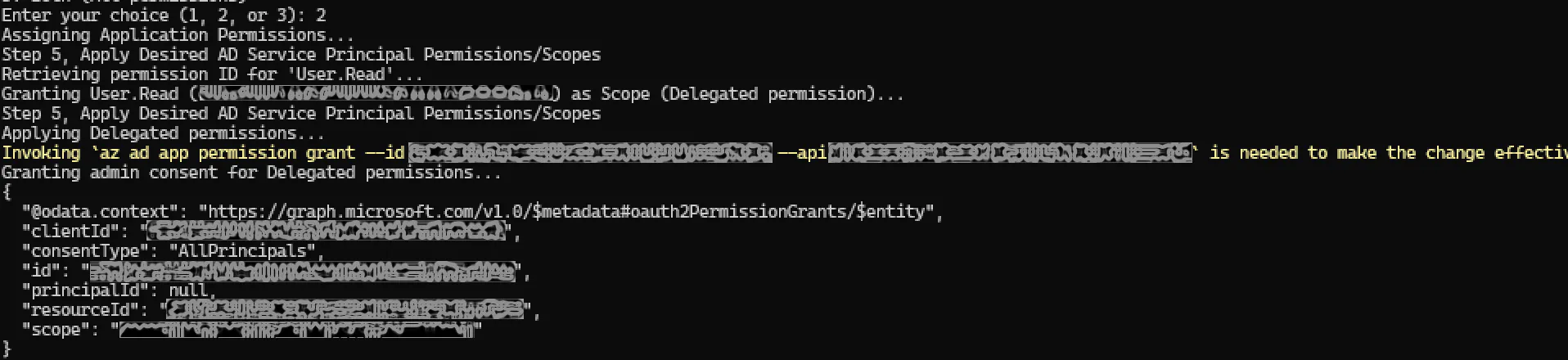 az ad app permission grant --id $AppId --api $GraphAppId --scope ($DelegatedScopes -replace "=Scope", "" -join " ")