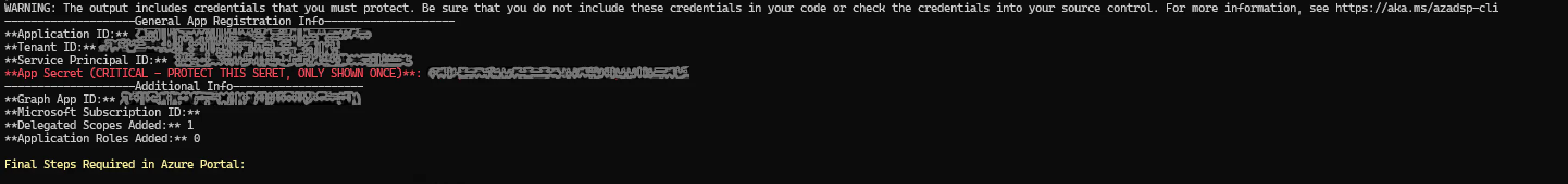 Write-Host "**App Secret (CRITICAL - PROTECT THIS SERET, ONLY SHOWN ONCE)**: $AppSecret" -ForegroundColor Red