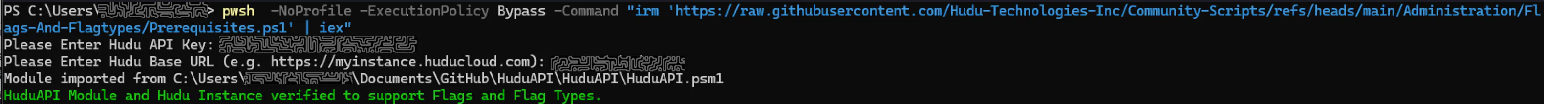 irm 'https://raw.githubusercontent.com/Hudu-Technologies-Inc/Community-Scripts/refs/heads/main/Administration/Flags-And-Flagtypes/Prerequisites.ps1' | iexYou can run this command from an existing powershell session start a new one Run-Command Dialog (Start+R / ❖+R) and typing 'pwsh'