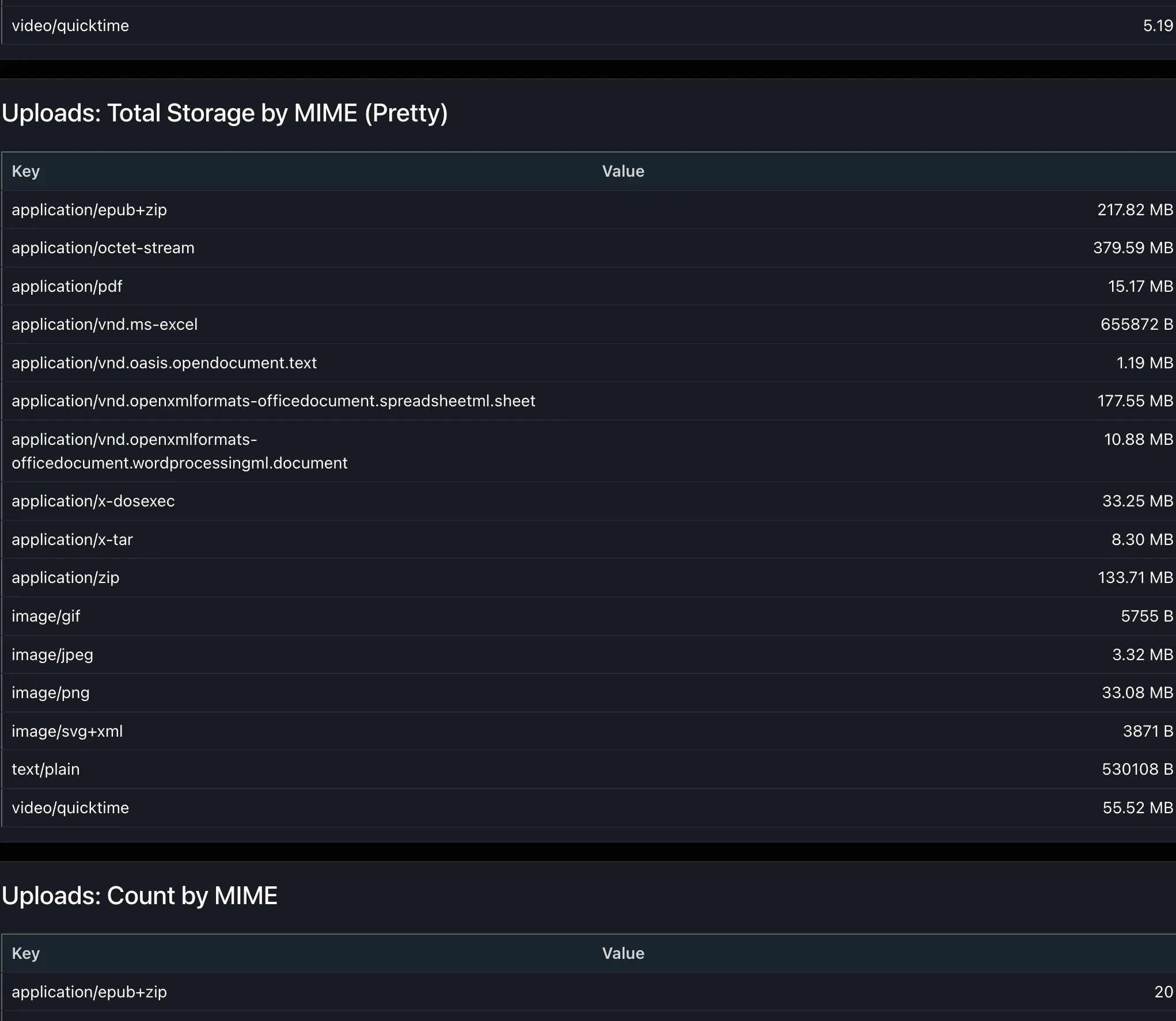 Uploads By MIMEtype / Filetype - a breakdown of how many of which files are most prominent