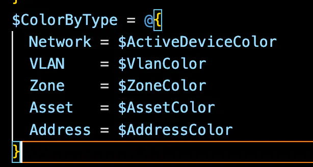 To customize your color palette/scheme, you can simply replace any of the reference colors in this section. Some of these may be subsequently referenced in the $ColorByStatus or $ColorByType lookup tables, just something to take note of.