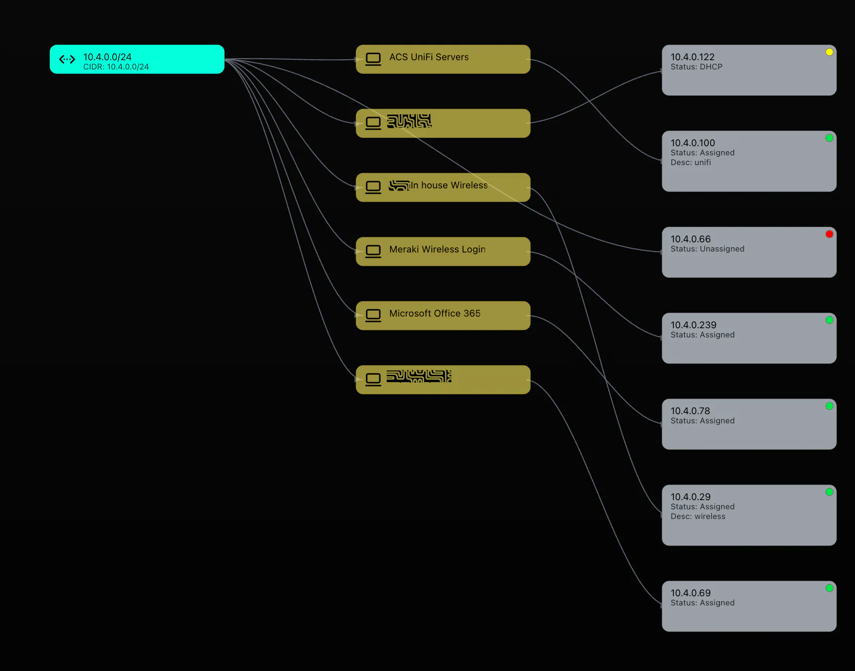 IP Addresses are rightmost, tied to asset, or directly linked to network (Grey)