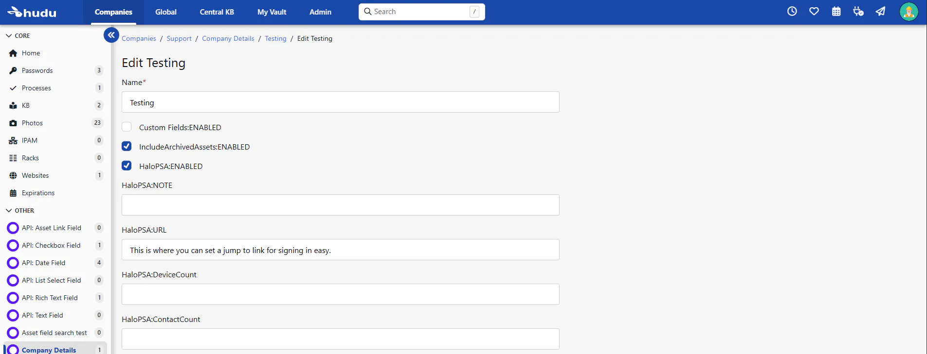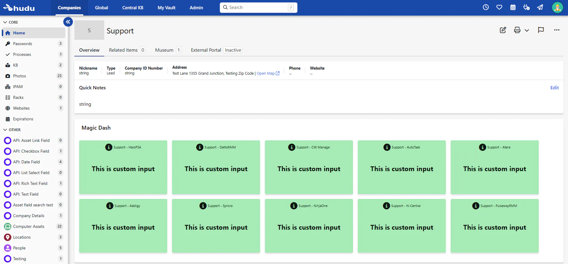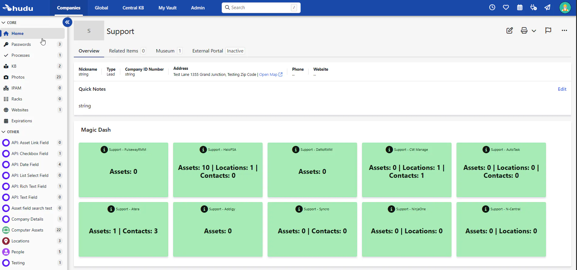 You can choose not to use the automation part, and fill out custom data to be pushed to magic dash tiles via Hudu's API. Please note integration Asset are counted as a WHOLE, not the individual cards. Meaning that if you have 3 cards from one integration or more in one Asset, this will show up in the magic dash as one Asset counted. If you are using Connected Fields, please ensure these are setup properly as duplicate Assets may cause miscounting.