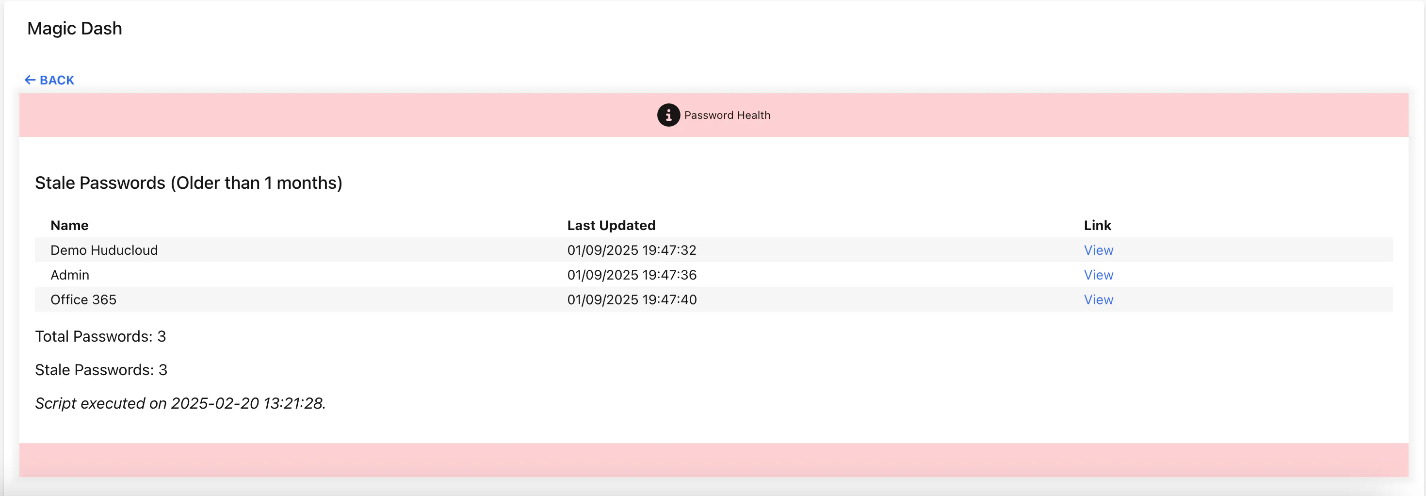 Generates a Magic Dash widget to display any passwords that have not been updated in the last 6 months (default).